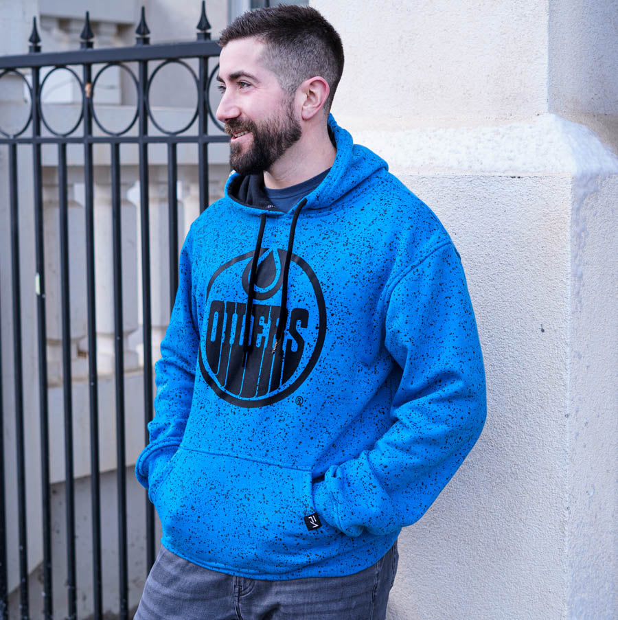 Take your home team pride to the next level with this brand-new Oilers Blue Venture Hoodie. Complete with screen printed speckled detail, custom drawstring tips, inner 'Lets Go Oilers' necktape and an oversized Edmonton Oilers Logo front / center; this hoodie is sure to make you stand out in the crowd!
